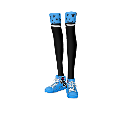 Blue sneakers with white string and black PS written on the sides. Comes with black stockings that have a blue cuff with a black pattern of tiny bows.