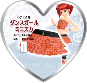 Dancing Girl Miniskirt (ダンスガールミニスカ) is a star-type Prism Stone. It was worn by Aira Harune in Pretty Rhythm Aurora Dream.