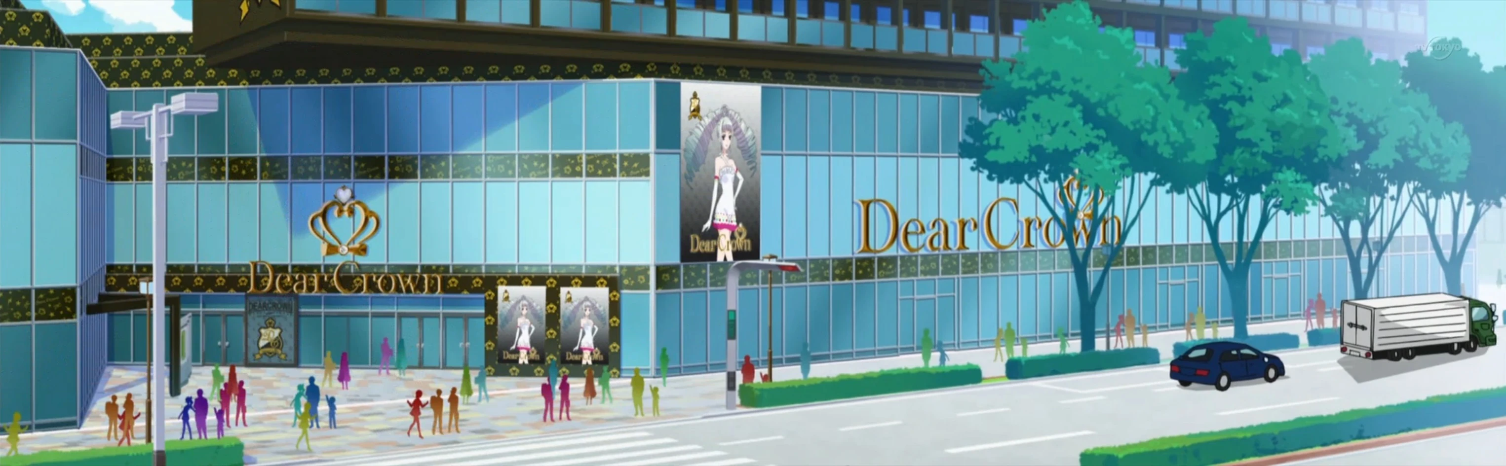 In Pretty Rhythm Rainbow Live, Dear Crown is a famous fashion brand shop across from the store Prism Stone. The General Manager of Dear Crown is Natsuko Mihama. Juné Amou is a Prism Star model that works and is the representative of Dear Crown. In Episode 51 of Rainbow Live, Naru Ayase became the new manager of Dear Crown.