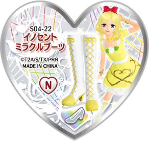 Innocent Miracle Boots (イノセントミラクルブーツ) is a star-type Prism Stone. It was worn by Otoha Takanashi and Wakana Morizono in Pretty Rhythm Rainbow Live.