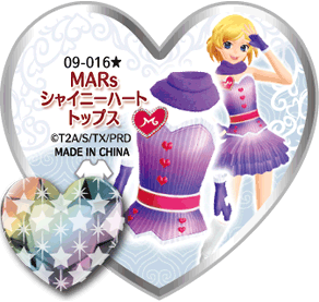 MARs Shining Heart Tops (MARsシャイニーハートトップス) is a star-type Prism Stone. It was worn by Mion Takamine in Pretty Rhythm Dear My Future. It resembles the MARs Shining Star Tops and the MARs Shining Ribbon Tops.