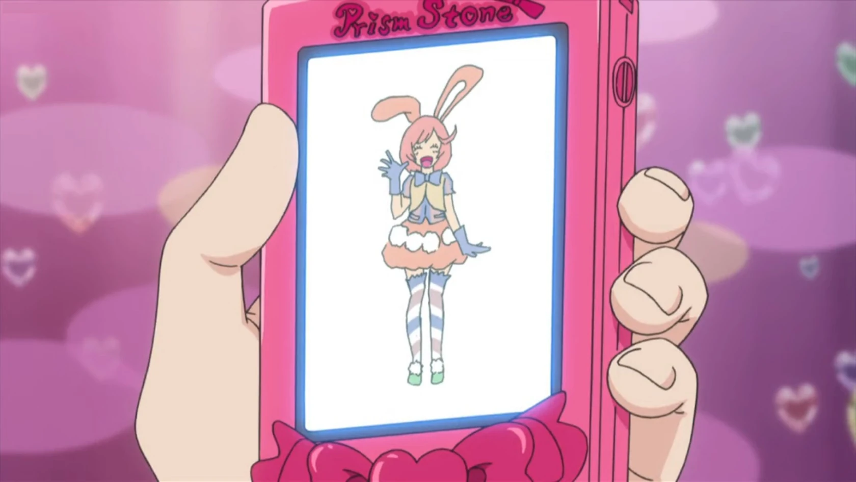 During the night, she sees Rinne who disappears after looking at the rabbits on the moon and leaves the rabbit origami. Naru comes up with an idea to use origami as invitations for their Prism Stone-like Easter. Ann and Rinne also help out and Naru even comes up with matching bunny-eared maid outfit that Ito refuses to wear. As it is Ito's turn to perform for the customers, she ends up playing a rock concert which leaves them feeling cold, so Naru ends up performing a Prism Show to satisfy the customers and is joined by Rinne who performs four consecutive jumps once again. With their first event successful, Naru decides to take a photo to commemorate it and Ito ends up wearing the bunny-eared maid outfit.