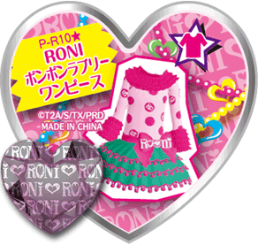 RONI Pon-Pon Lovely One Piece (RONIポンポンラブリーワンピース) is a lovely-type Prism Stone. This stone is a collab from the real brand RONI and has not appeared in the anime.