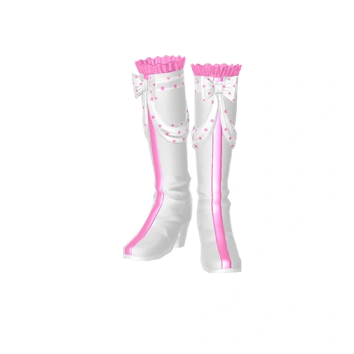 White boots with pink ruffles on top and a thin pink line that goes down the center of the boots. At the top of each boot is a single white bow with the tails wrapping around the shoe, decorated with tiny pink polka-dots.